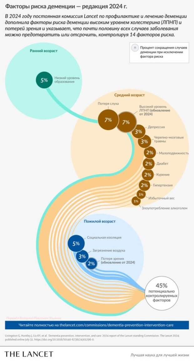 Многим известна хотя бы часть факторов, которые могут влиять на уменьшение риска деменции. Например, что умственная стимуляция помогает снизить риск слабоумия в пожилом возрасте. Но какая именно и как? Прекраснейший ресурс «Конспекты Юджина» решил пойти дальше и рассказать, а что конкретно влияет на риск развития деменции и болезни Альцгеймера и почему. Для этого автор взял огромный свежий отчёт по теме в журнале The Lancet, вышедший летом 2024 года, выделил 14 изменяемых факторов риска и подробно о них рассказал. А мы, с благодарностью и с любезного разрешения автора, публикуем этот большой труд.