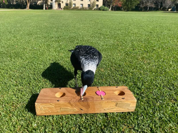 Например, у цихловых рыб Neolamprologus pulcher размер группы, в которой подрастали мальки, влияет на развитие социальных навыков и относительный размер нескольких областей мозга (S. Fischer et al., 2015. Rearing-Group Size Determines Social Competence and Brain Structure in a Cooperatively Breeding Cichlid), а хронический социальный стресс в подростковом возрасте увеличивает вероятность когнитивных нарушений у стареющих самцов мышей (V. Sterlemann et al., 2009. Chronic social stress during adolescence induces cognitive impairment in aged mice). Впрочем, сказанное выше относится не ко всем животным: например, не было обнаружено никакой связи между социальными условиями в детстве и успешностью в обучении у колючих сцинков Egernia striolata (J. Riley et al., 2018. Learning ability is unaffected by isolation rearing in a family-living lizard).Чтобы больше узнать о взаимосвязи социального и когнитивного поведения, нужно исследовать больше видов, а в качестве меры «социальности» учитывать не только количество особей в группе, ведь большое общество не гарантирует широких социальных связей (R. Morrison et al., 2020. Comparing measures of social complexity: larger mountain gorilla groups do not have a greater diversity of relationships). Австралийские вороны-свистуны (Gymnorhina tibicen) оказались идеально подходящим для такой работы видом, ведь эти птицы умны, высокосоциальны и охотно решают когнитивные задачи даже без отлова и обучения (B. Ashton et al., 2018. Cognitive performance is linked to group size and affects fitness in Australian magpies). Хотя их называют «воронами», они относятся к другому семейству, ласточковым сорокопутам (Artamidae), чьи представители встречаются в Австралии, Индо-Тихоокеанском регионе и Южной Азии. А прозвище «свистунов» они получили за свое своеобразное пение, которое в поэме «Сороки» (The Magpies; по-английски этих птиц за сходство с нашими сороками называют «австралийскими сороками») было своеобразно описано как «куордл-удл-ардл-уордл-дудл».