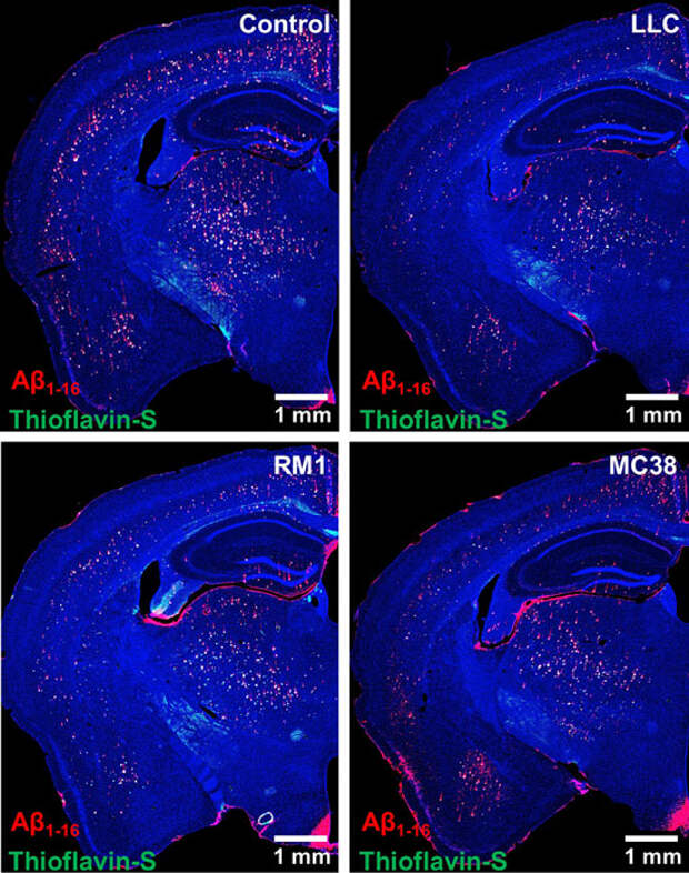 Есть у них, пожалуй, одно общее свойство: они имитируют самые распространенные и опасные типы рака у человека. И у них выявилась еще одна общая черта: все три опухоли существенно подавляли образование амилоидных бляшек в мозге альцгеймеровских мышей и замедляли развитие болезни Альцгеймера. Конечно, патология всё равно развивалась — но слабее и позже, чем у мышей из контрольной группы (рис. 1). Более того, протективный эффект сохранялся, даже если мышам не имплантировались сами опухоли, но вводились смеси секретируемых ими белков.