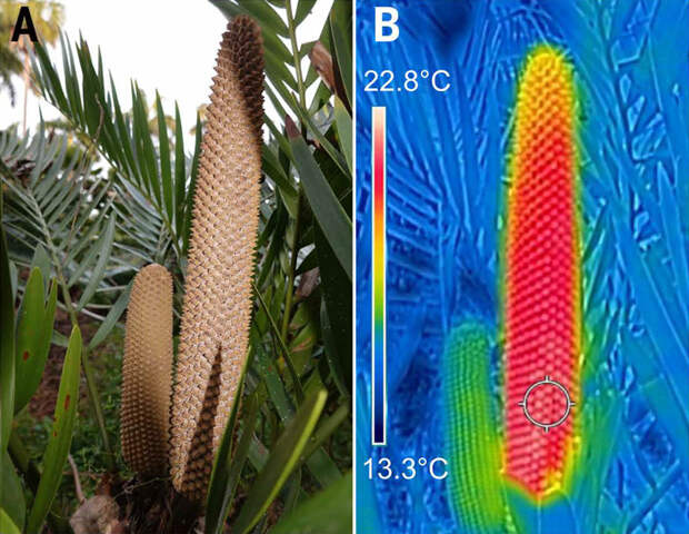 Сначала исследователи обратились к тепловизору. С его помощью они получили термические изображения саговника замия шелушащаяся (Zamia furfuracea) и подтвердили наличие «нагревательного эффекта» в пылящих мужских шишках (рис. 1). Именно эти структуры, а не всё растение целиком, работают как локальные тепловые генераторы.