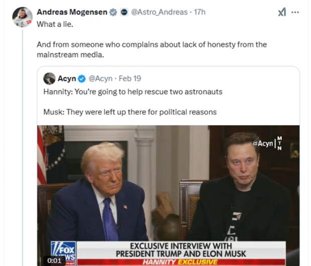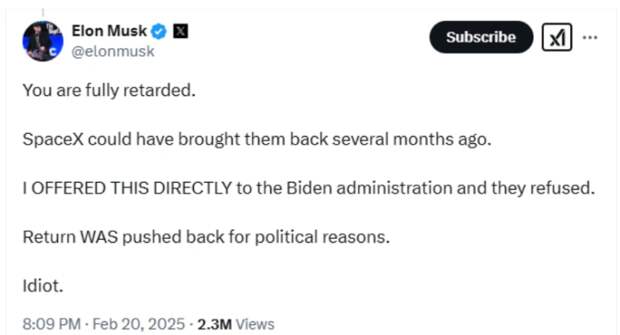 Позже Илон Маск сделал ряд резких заявлений, утверждая, что решение оставить астронавтов на полгода было продиктовано политическими соображениями администрации Байдена. Европейский астронавт Андреас Могенсен вступил в полемику с Маском по поводу этого утверждения, за что Маск назвал астронавта идиотом и умственно отсталым (retard).