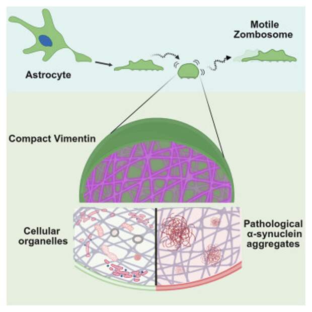 Они лишены ядра и в 20 раз меньше астроцитов, но сохраняют белковые маркеры родительских клеток, включая виментин – белок промежуточных филаментов, а также содержат интактные митохондрии.Протеомный анализ выявил 3425 белков в зомбосомах, из которых 3184 присутствовали в астроцитах. Наиболее многочисленным оказался именно виментин. Обнаружились и белки цитоскелета, митохондрий, остатки от метаболизма, белки адгезии (прикрепления) и подвижности.