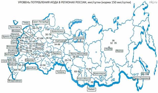 Учитывая нормы и данные из карты, можно легко рассчитать необходимость в дополнительном приеме йода. Большинству россиян желательно ежедневно принимать дополнительные 100 мкг йода, а беременным и кормящим женщинам показано дополнительно 200 мкг/сутки. В период роста организма у детей потребность в йоде также увеличивается. Добавка йода в питание в йододефицитных районах увеличивает IQ детей на 12 баллов.