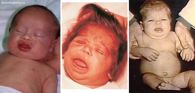 При йододефиците средней степени во время беременности, кроме гипотиреоза у женщины, у новорожденных также наблюдаются внешние признаки данного заболевания - увеличенные шея и язык, отечность, сонливость: