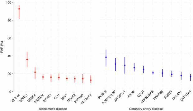 Доля случаев болезни Альцгеймера и ишемической болезни сердца, которые можно предотвратить, воздействуя на молекулярные пути, связанные с десятью основными генетическими локусами риска для каждого заболевания. Наибольший фактор риска для болезни Альцгеймера несет сочетание аллелей APOE3 и APOE4. Credit: Dylan M. Williams et al. / npj Dementia 2026