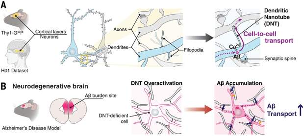 Ученые обнаружили новую функцию нанотрубчатой сети, которая разрастается в виде мини-отростков на дендритах нейронов. По ней бета-амилоид транспортируется от нейрона к нейрону, опосредуя развитие болезни Альцгеймера. Работа опубликована в журнале Science.