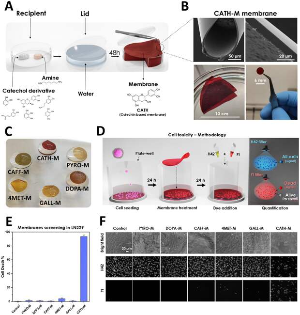 Этапы создания и результаты тестирования гибких катехоловых мембран, среди которых образец CATH—Mпродемонстрировал наибольшую эффективность в уничтожении клеток глиобластомы путем направленного разрушения их защитных оболочек. Credit: Jose Bolaños‐Cardet et al / Advanced Science 2026