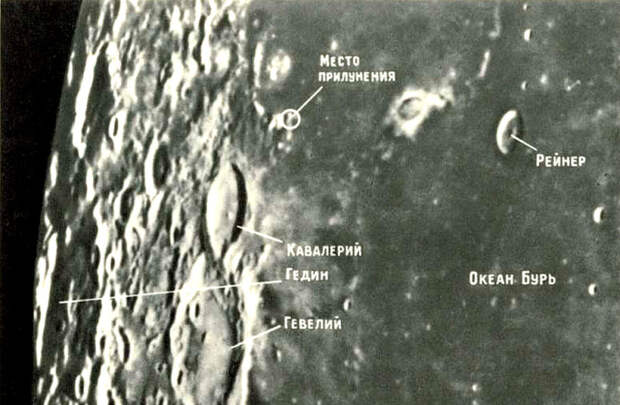 Аппарат немного наклонился в одну сторону, что позволило ему наблюдать своей фотокамерой с одной стороны близкую поверхность Луны, а с другой — её дальний горизонт.