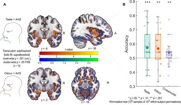 Унивариантный анализ подтвердил, что вкусовые стимулы активировали первичную вкусовую кору, а запахи – первичную обонятельную область. А вот мультивариантный анализ продемонстрировал значительно более любопытную картину. В функциональной области островка, реагирующего на вкусы, классификатор успешно различал сладкий и пикантный вкусы, но неожиданно та же область позволила различить запахи с точностью до 56,67%, хотя унивариантно запахи там не проявлялись. Главным открытием стало то, что кросс-модальный классификатор, обученный на вкусах и протестированный на запахах (и наоборот), показал точность выше случайной (53,83%, p = 0,009), что доказывает перекрытие нейронных паттернов.