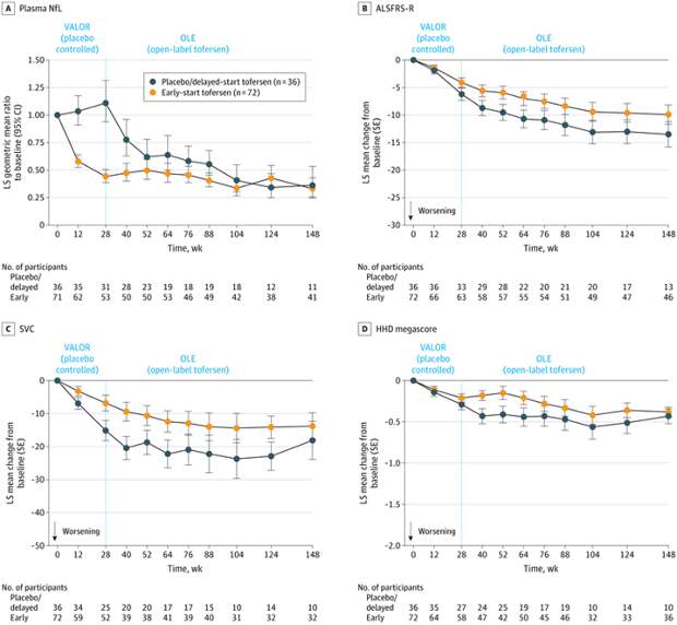 В исследовании участвовали 108 пациентов. Сначала их разделили на две группы: одна сразу получала тоферсен, а другой в течение 28 недель вводили плацебо. Затем все желающие пациенты перешли в следующую фазу, где уже все получали настоящий препарат. Общее наблюдение за пациентами продолжалось до пяти с половиной лет. Это позволило сравнить эффект раннего и позднего начала лечения.