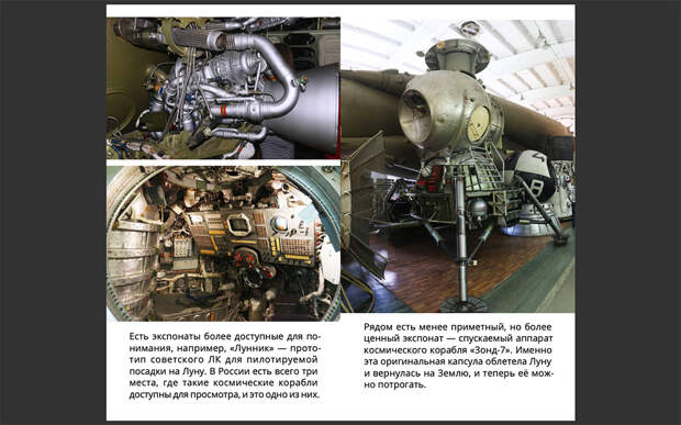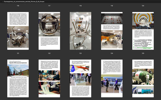 «Путеводитель» пока издан в электронной форме, но в планах заняться печатью и на бумаге. Сейчас это PDF-файл из 560 страниц, на которых рассказывается и показывается в многочисленных фотографиях о 63 различных космических объектах на территории России и 5 атомных. В обзор попали не только космодромы, обсерватории, научно-исследовательские институты, и предприятия отрасли, но и природные места и населенные пункты, которые дают возможность так или иначе ощутить себя за пределами нашей планеты.