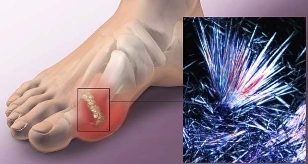 Проблема в том, что мочевая кислота плохо-растворима в водной среде организма и при избытке кристаллизуется, оседая в различных тканях. В первую очередь кристаллы накапливаются в пальцах ног, так как здесь ниже температура, что еще сильнее снижает растворимость.